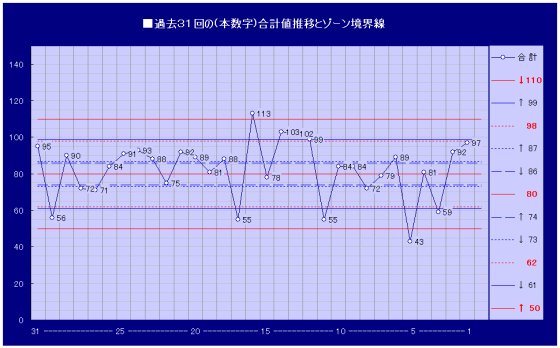 当サイトが提唱する「エリア選択」という予想法のために提供している資料で、過去31回の抽選結果を基に本数字5個の合計値を算出し、その推移をグラフにしたシートです。
