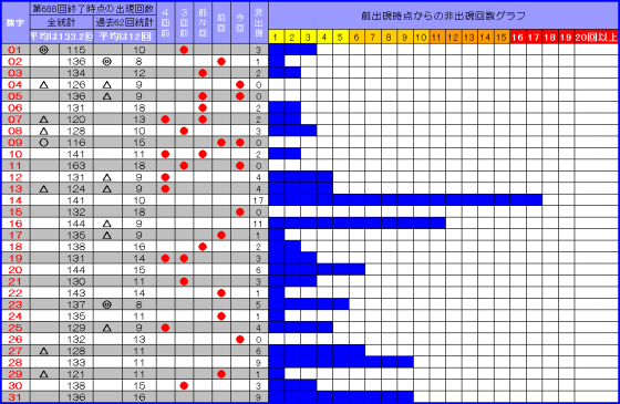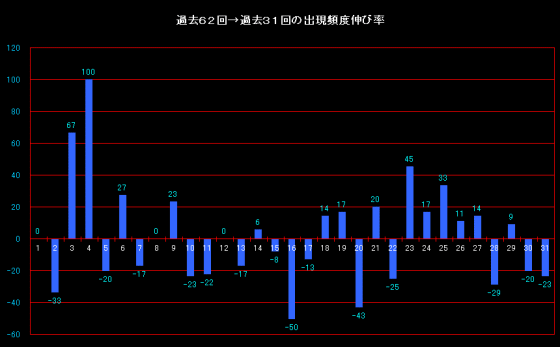 上図の[出現間隔指数]を補足するためのグラフです。上図では、平均出現間隔に対するレベルも表していますが、この[伸び率]グラフは、単純に過去62回から過去31回にかけての出現間隔を比較しています。従って、例えば出現間隔が平均を下回っている数字でも、過去62回から過去31回にかけて出現回数が多くなっていれば伸び率は大きくなり、注目数字をピックアップできることになります。