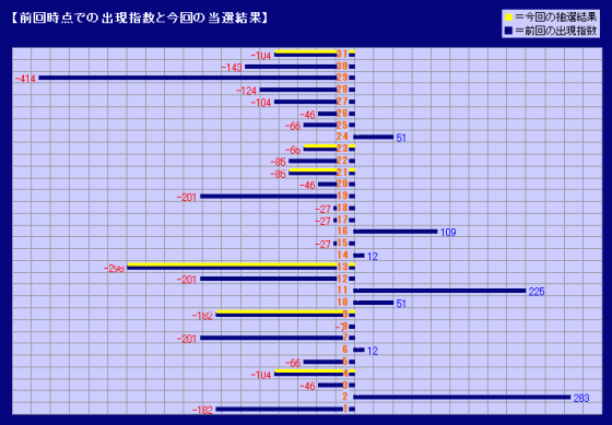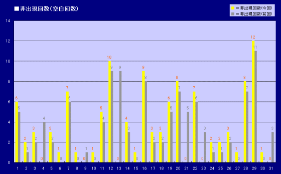 各数字の非出現回数(空白回数) をグラフ化したものです。黄色の棒グラフおよび数字は集計時点での非出現回数を表し、灰色の棒グラフは1回前(前回)時点での非出現回数を表しています。