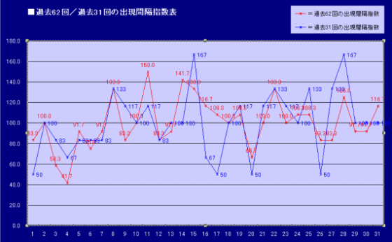 各数字の最近における出現頻度を指数化したものです。このグラフは、「最近よく出ている」とか「このところ出ていない」といった、数字の出現傾向を分析したもので、赤の折れ線は過去62回の出現頻度指数であり、青の折れ線は過去31回の出現頻度指数です。グラフの読み方としては、平均出現間隔の指数が100ですから、例えば下図の「15」や「28」のように100を上回っていれば、平均以上の出現回数を重ねていることを表しており、しかも「28」のように赤の数値に比べて青の数値が大きく上回っていれば、少なくとも過去62回の中で最近(過去31回)の出現頻度が、急速に高まっていることを表しています。