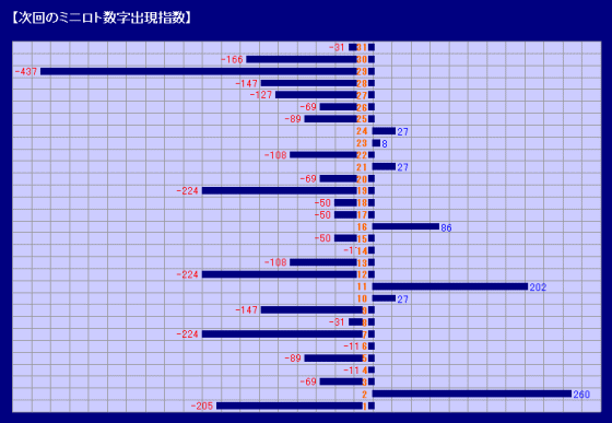 第1回から最新回(入力・更新した最新回)までのデータをもとにした出現指数をグラフ化したもので、赤字のマイナス数値が大きいほど 統計上出現する可能性か高いことを表しています。この統計は、最新回から過去62回分のデータをもとにした[過去62回]などのグラフもあります。