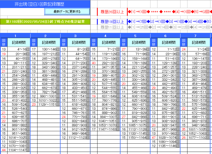 各数字の出現特性を知る一つの手掛かりとして、各数字が過去にどんな非出現(空白)回数を記録したのか、特に11回以上の非出現(空白)回数を記録した時期と回数を履歴として残すようにしています。予想に際して、気になる数字の特性を知る時に利用します。例えば、この数字は非出現を繰り返しやすい数字なのかどうか、繰り返しやすいとしたら過去にどんな非出現回数を記録しているのか、といった情報を得て参考にします。[Data]シートの最新実施回数を確認しながら、未処理のデータが増えてきたらユーザー自身の判断で更新していきます。