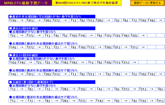 当サイト・トップページで、毎回紹介している「ミニロト予想のための最新統計データ」の原本となるシートで、抽選結果をもとに主要なデータを一覧表にまとめたものです。最新の[Data]に基づく予想データを見る場合は、シート上部の[最新データに更新する]ボタンをクリックしてください。