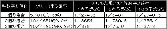 そこで 何とか1等的中という幸運の女神を引き寄せる予想法はないものかと考えられたのが、本命というか予想の中心となる軸数字を決める方法です。 これは例えば[A]という数字を軸数字に決めたら[A]を含む数字の組合せを予想します。そして抽選の結果、本数字5個の中に[A]が入っていなければ少なくとも1等は「ハズレ」となりますが、入っていれば第一関門突破となり1等的中の確率はかなり高まるというものです。 因みに下表は軸数字として決めた個数と、これをクリア出来る確率、さらにはクリア出来た場合の1等的中確率を表したものです。