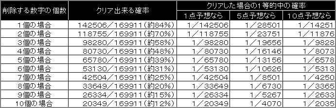 このように第一段階を手頃(クリア出来そう)な確率に挑戦することにより、クリア出来た時の確率を現実味のある確率にまで高めようというのがこの予想法で、こうした手法は他にもあり、例えば出ないであろうと思われる数字を削除して、クリアした時の確率を高めていくという方法もあります。下の表は、ミニロトで出ないと思った数字を予想から除外した場合、各個数が全てクリア出来る確率と、クリア出来た場合の1等的中確率を表したものです。