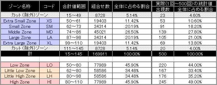 上の図は、ゾーン名称:ゾーンコード(略称)、その下に合計値の範囲(該当する組合せ数)を表しています。従って、毎週変わる合計値の推移を参考にしながら、あまり自信がなければ[Low Zone]や[High Zone]を、 もう少し絞り込めるようなら[Little Low Zone]や[Little High Zone]を、思い切って勝負するなら[Extra Small Zone]から[Extra Large Zone]まである5つのゾーンから 選択してみるというように、その時々によって楽しめるようになっています。